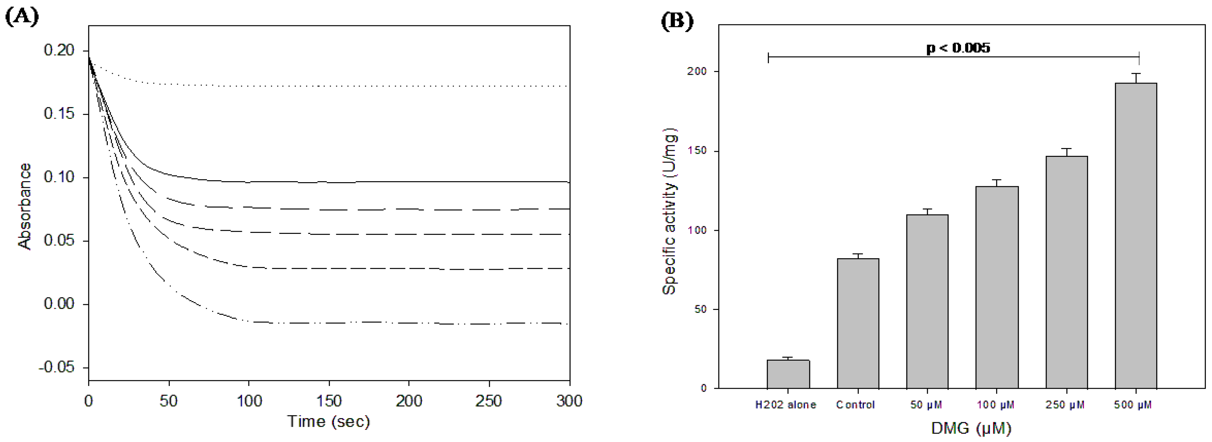 3.3. DMG Enhances Catalase-Mediated Decomposition of Hydrogen Peroxide