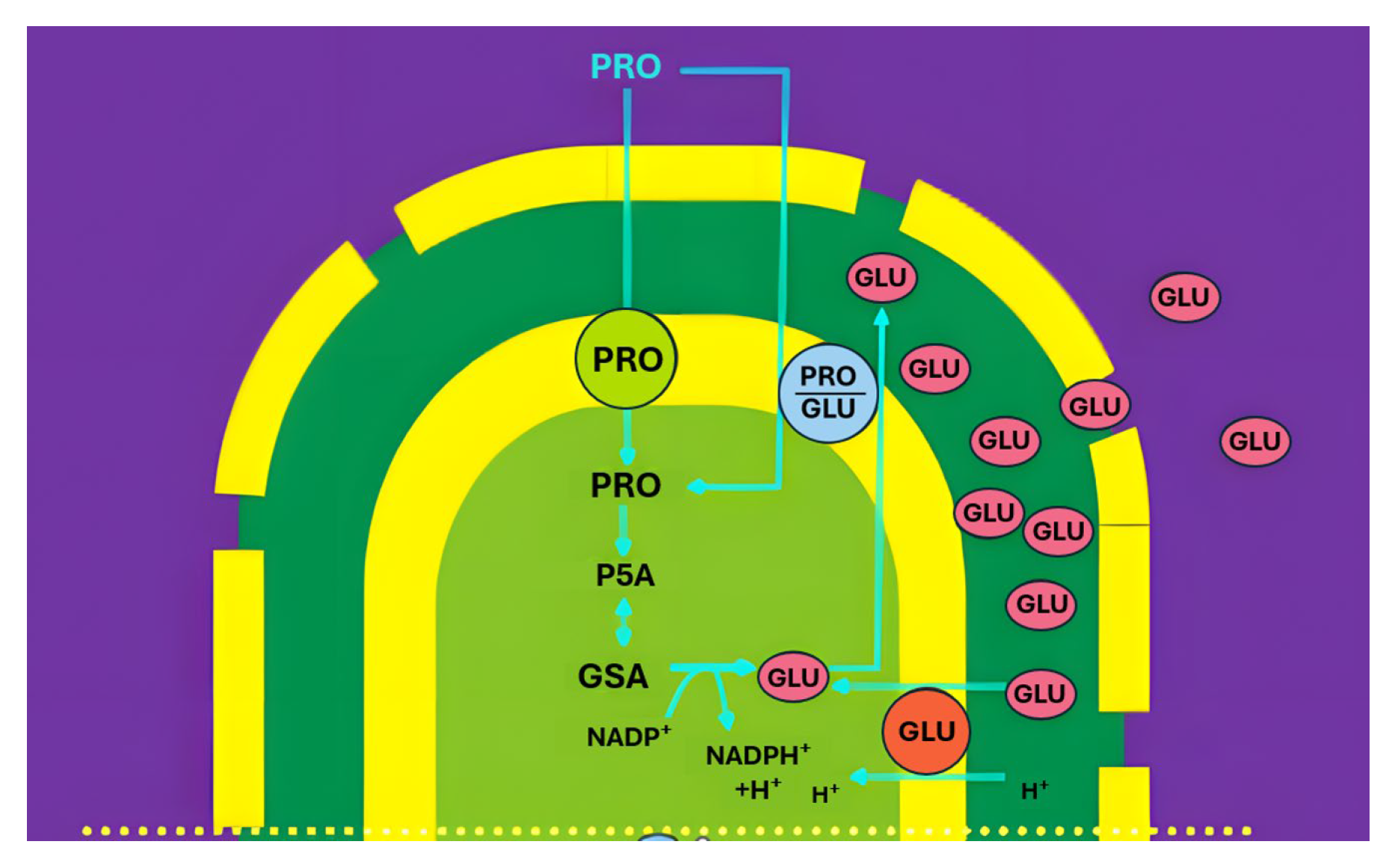 2]. The exchange was shown to be driven by the electrochemical proton gradient, with a ΔΨ-dependent proline/glutamate translocator acting together with a ΔpH-dependent glutamate/OH