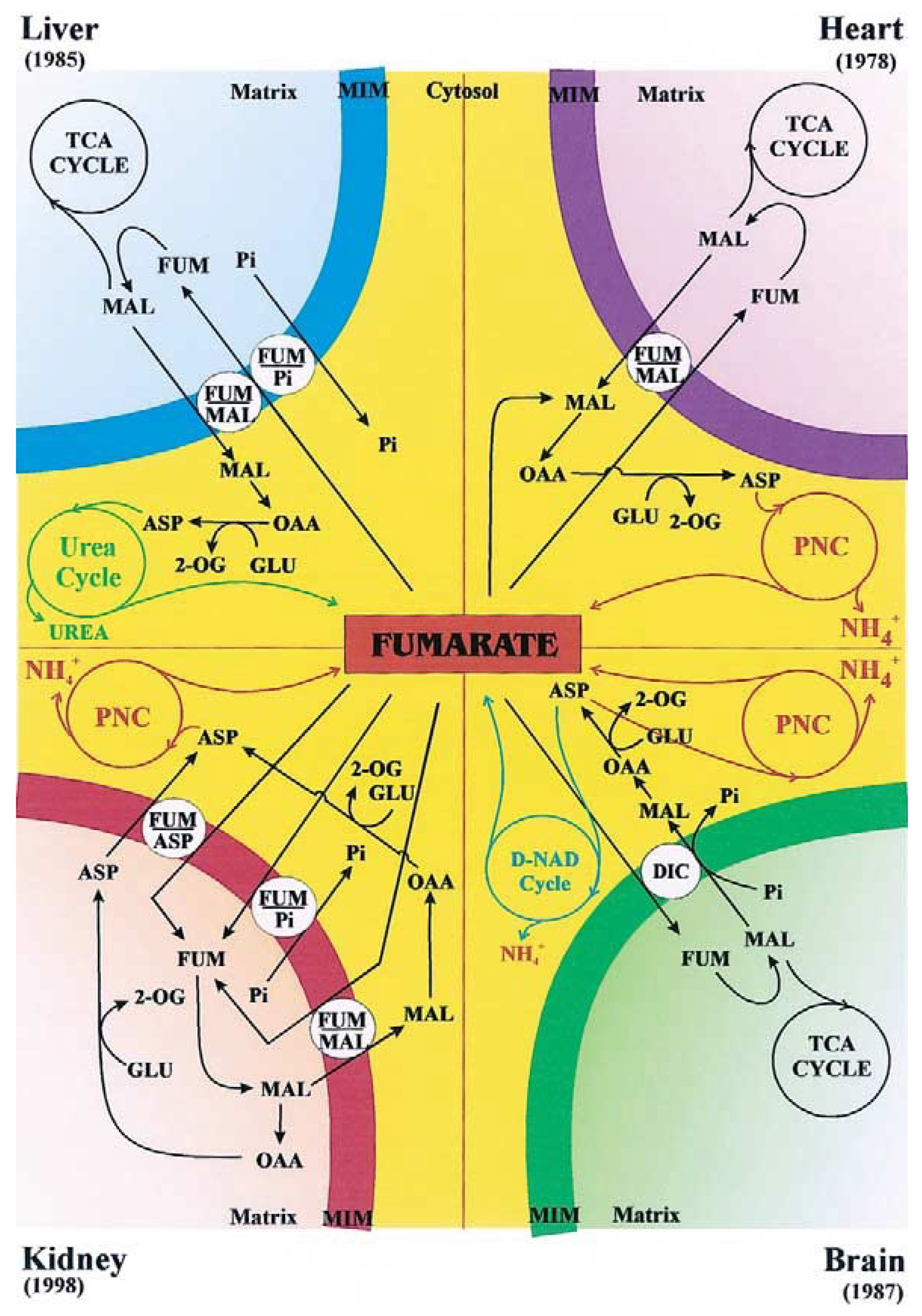 It is remarkable that nearly a century after the discovery of the urea cycle, the fate of cytosolic fumarate remains largely overlooked, not only in biochemistry textbooks, but even in the recent literature intended to clarify metabolic pathways. In one such article, the author states: “Similar to the urea cycle, the carbon skeleton of aspartate leaves the purine nucleotide cycle as fumarate in the cytosol. Even if the role of this compound is to perform the anaplerotic function of replenishing the citric acid cycle by being converted to oxaloacetate, to do so it must first enter the mitochondrial matrix. Because the mitochondrial inner membrane does not possess a transporter for fumarate, it must first be converted to malate in the cytosol” [