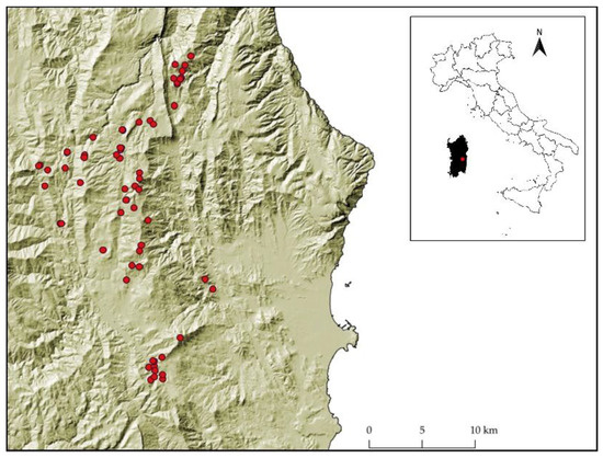 The research was carried out on Sardinia, Italy, the second largest island in the Mediterranean basin (24,100 km2), in the mountainous area of the Ogliastra region, which is located in central-eastern Sardinia (Figure 1), at an altitude ranging between 290 and 1350 m a.s.l. The climate is typically Mediterranean, and is characterized by two main seasons, a hot-dry and a cold-humid season [15]. The vegetation is composed of meso-Mediterranean silicicolous shrublands, Sardinian holm-oak forests and supra-Mediterranean holm-oak forests, Mediterranean riparian elm forests, Southern and Sicilian Italian Quercus pubescens woods, Mediterranean xeric grasslands, evergreen oak matorral and Juniper matorral, and conifer plantations, according to the Map of the Habitats of Sardinia [16].