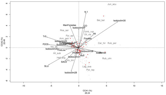 Canonical correspondence analysis (CCA) triplot. The ordination triplot shows the relationship between abiotic, biotic, and management predictors (black arrows), and the plant species (grey crosses) within the different plots (red dots) on the vegetation matrix (231 species × 63 plots). Species codes: All_sub—Allium subhirsutum; Arm_gen—Armeria sardoa subsp. genargentea Bel_bel—Bellium bellidioides; Car_hir—Cardamine hirsuta; Dit_vis—Dittrichia viscosa; Hell_arg—Helleborus argutifolius; Jun_acu—Juncus acutus; Lag_ova—Lagurus ovatus; Pot_rep—Potentilla reptans; Pyr_spi—Pyrus spinosa; Ros_ser—Rosa serafinii; Rub_per—Rubia peregrina; Rub_ulm—Rubus ulmifolius; Umb_rup—Umbilicus rupestris; Vic_lat—Vicia lathyroides; Vio_lim—Viola limbarae.