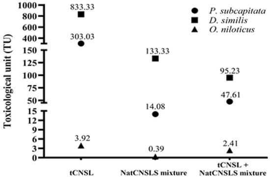 The tCNSL showed the highest toxicity in all three test organisms. The NatCNSLS mixture was the least toxic product to P. subcapitata and O. niloticus. The tCNSL + NatCNSLS mixture emulsion was the least toxic product for D. similis and presented an intermediate toxicity for the other two test organisms (Table 1).
