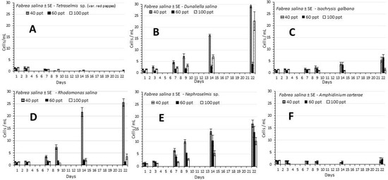 The development of the density ± SE of F. salina (cells/mL) in the different treatments of microalgae used at the salinities of 40, 60 and 100 ppt. (A) Tetraselmis sp. (var. red pappas), (B) Dunaliella salina, (C) Isochrysis galbana, (D) Rhodomonas salina, (E) Nephroselmis sp., (F) Amphidinium carterae.