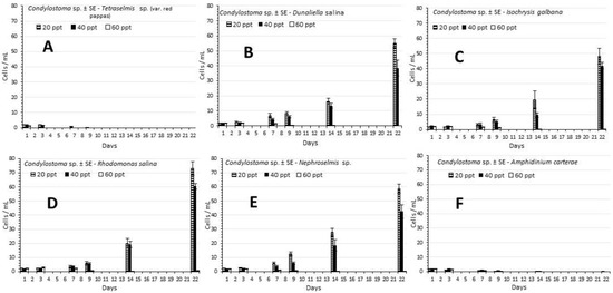 In contrast to F. salina, the culture densities of Condylostoma sp., except for Tetraselmis sp. and A. carterae, in which there was zero growth (Figure 3A,F), exhibited a smoother and larger increase during the culture period than the remaining 4 microalgae (D. salina, I. galbana, R. salina and Nephroselmis sp., Figure 3B–E, respectively). A common feature to all was the zero growth at the highest salinity of 60 ppt. Overall maximum densities attained on the 22nd day were in the region of 50–80 ind./mL almost double or triple of the equivalent values for F. salina. Comparing the densities on the 22nd day, there are significant higher values (p < 0.05) recorded in the salinity of 20 ppt than the salinity of 40 ppt in D. salina, R. salina and Nephroselmis sp., (55 vs. 38.6, 73 vs. 60.5 and 58.7 vs. 42.6 ind./mL, respectively). In I. galbana both values 48.2 and 41.9 ind./mL were statistically equal (p > 0.05). The above situation as presented on the 22nd day was also evident the days before, when on the 14th day the values started to ascend in comparison with the previous time, while until the 9th day growth remained low and this was reflected on the SGR and Tg (Table 1) where, comparing growth between 1st and 7th day and between 7th and 14th day, in the latter case the values almost doubled in SGR and halved in Tg.