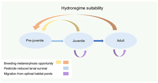 Life history representation demonstrating potential adjustments for hydroregime suitability, including interannual breeding-through-metamorphosis opportunity for both adults and juveniles, reductions in larval survival in response to aquatic pesticide exposure, and possible migration from nearby ponds with increasing subpopulations.