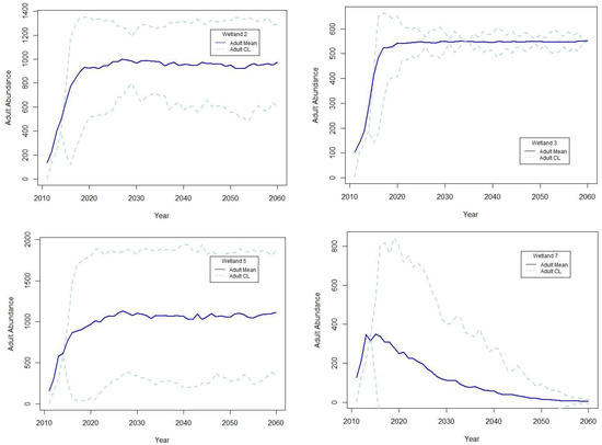 The number of consecutive years of reproductive failure influenced simulated population abundance in both chronologically specific and probabilistic models, but probabilistic models were less likely to include long sequences of any single hydroregime classification. Therefore, when the same proportion of OHY, MHY, and IHY were randomly assigned in probabilistic models, propagation of uncertainty resulted in extremely variable long-term estimates of adult abundance (Figure 3) compared to chronologically specific simulations (Figure 2). Uncertainty in probabilistic simulations was greatest in the two wetlands with relatively even distributions of hydroregime suitability classifications (wetland 2 with 0.39, 0.22, and 0.39 probability, and wetland 5 with 0.24, 0.22, and 0.53 probability of OHY, MHY, and IHY, respectively). Wetlands with probabilities more heavily skewed toward OHY (wetland 3 with 0.59) or IHY (wetland 7 with 0.82) were more precise in long-term projections of population trends, and results qualitatively corroborated the final result of simulations based on climate model forecasts of hydroregime suitability, demonstrating the same population increase (wetland 3) or decline (wetland 7; Figure 2 and Figure 3).