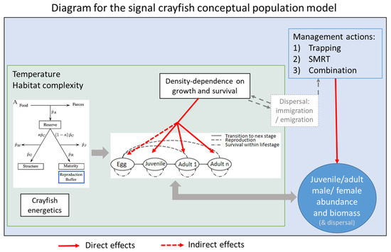 In this study, we followed the steps outlined in Pop-GUIDE to develop a conceptual model for application to invasive species, specifically the management of one of the most successful aquatic invaders, the signal crayfish. Briefly, the conceptual model captures the life history of the signal crayfish, as well as implicitly capturing the spatial and dominance behaviors of individuals that result in population density regulation mechanisms. Physiology and life history of individual crayfish are described within the context of the DEB theory where growth, maturation, and reproduction are functions of underlying physiological processes and are driven by food availability and thermal conditions. Crayfish are mostly omnivorous, and food is usually not the limiting factor for their growth and survival, which are typically more limited by the availability of shelters from predators and competitors. In this model, we, therefore, did not assume any food limitation, but assumed density effects on size-dependent survival as smaller individuals are more at risk from cannibalism and predation. The larger the individual gets, the higher probability that it will manage to occupy a shelter and increase its survival probability. We did not include explicit territoriality and dominance hierarchies as quantitative evidence for their effects on individual survival, growth and reproduction is currently missing. However, as a proxy, we included density-dependent functions—driven by population density and shelter availability—on individual condition and growth. Model conceptualization conducted in this study will be followed by implementation and testing, and ultimately application to address and support management actions geared towards signal crayfish population control. The model will further be applied to explore the impact of dispersal on different population control options, as well as evaluate control efficacy under various dispersal scenarios.