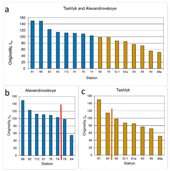 Figure 3. Originality of phytoplankton composition at stations: from all lists of LIT (a); Tashlyk reservoir (b); Alexandrovskoye reservoir (c). The red line separates stations where txx originality values are greater than and less than 100.