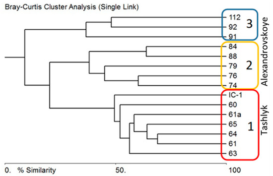 Bray–Curtis Cluster Analysis was carried out to compare the distribution of plankton algae at the stations of both reservoirs. At the first stage, we calculated the levels of similarity for the abundance of the entire species composition for all stations. Figure 4 shows that the similarity of communities across the stations of the Tashlyk reservoir is presented in one cluster (1) and separates from the others at the level of 50%. Clusters 2 and 3 unite the communities of the Alexandrovskoye reservoir stations. Moreover, it can be seen that these are two different clusters, which successively combine the stations of the upper (2) and lower (3) sections of the reservoir, that is, they correspond to two different water bodies of the reservoir.