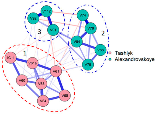 To clarify the revealed difference in the composition and abundance of phytoplankton communities, a correlation analysis was carried out in the Program JASP. Figure 5 shows a network diagram of correlations and it can be seen that the communities of the Tashlyk reservoir have separated from the communities with cluster 1 of the Alexandrovskoye reservoir quite clearly and form their own clusters 2 and 3. At the same time, the communities of the Alexandrovskoye reservoir formed two partially separated clusters corresponding to two different water bodies along the reservoir axis, located from north to south (stations 74–88) as cluster 2, and from west to east (stations 91, 92 and 112) as cluster 3.