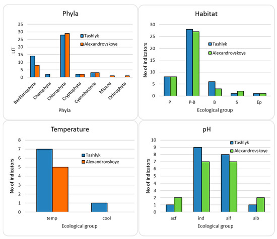 In 2018, 73 LIT of microalgae and Cyanobacteria from 7 phyla were found in the phytoplankton of two reservoirs (Table S3). In the Tashlyk reservoir, there were 52 LITs, of which 30 belonged to the Chlorophyta phylum, 15 to Bacillariophyta, 3 to Cyanobacteria and 2 of each to Cryptophyta and Charophyta. In Alexandrovskoye, there are 47 LITs (31—Chlorophyta; 8—Bacillariophyta; 4—Cyanobacteria; 2—Cryptophyta; and 1 Miozoa and 1 Ochrophyta). Common to both reservoirs were 26 LITs (35.6% of the total phytoplankton richness). Of these, 17 are green, 5 are diatoms, 2 are cryptophytic and 2 are Cyanobacteria. Representatives of other phyla were only found in one of the reservoirs. Thus, based on the analysis of the common lists, the composition of phytoplankton was different, since only one third of the encountered taxa were common.