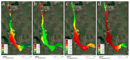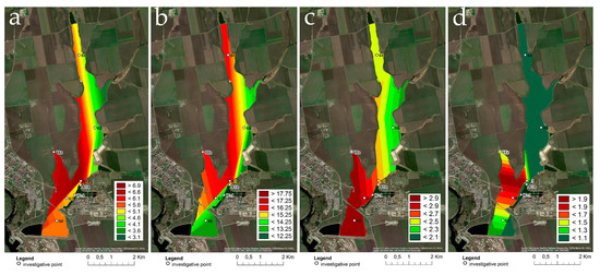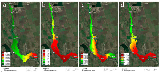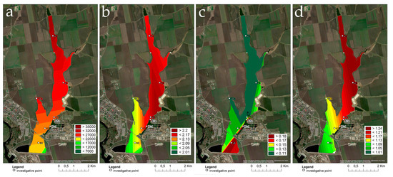 Figure 10. Combined statistical and landscape maps for the Tashlyk reservoir. Abundance (a); Index saprobity S (b); Ammonia (c); Index WESI (d). Colors are given for the value amplitude of each mapped variable from green (lower boxes in the legend key) to red (upper boxes in the legend key).