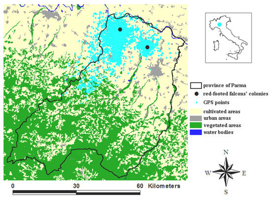 Through field surveys, we located the birds’ nests and habitual roost sites (i.e., large patches of trees regularly used by falcons). By means of digital orthophotos, we mapped all the rows of trees (>800 km) present in the study area in order to also detect occasional roost sites, i.e., small patches of trees rarely used by the tracked red-footed falcons. GPS data were transferred to the ArcView GIS [21] together with: (a) the boundaries of the province of Parma, (b) the digital orthophotos at a 1:500 scale, (c) the terrain elevation a.s.l. at 1:1000 scale, (d) the land cover at 1:10,000 scale, and (e) the nest and roost locations.