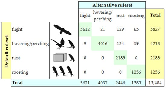 Sensitivity analysis validated the identification of the activity states. In fact, 96.91% of the GPS points was labelled in the same class by both the default and alternative threshold rulesets (Figure 2). The alternative ruleset estimated higher values for the two behavioral classes of “activity at nest” and “roosting”, and lower values for the two classes of “flight” and “hovering/perching”.