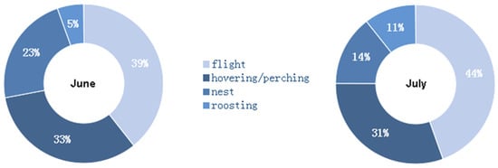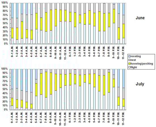 The hourly ethogram (Figure 7) shows clear patterns of the red-footed falcons’ behaviors. The flight activity was the maximum between 3 and 4 p.m. (62.87% of time) and the minimum between 4 and 5 a.m. (5.46% of time). It was elevated even after sundown (9–10 p.m.; 54.87% of time). Hovering or perching was the maximum in the 3 h interval after sunrise (6–9 a.m.; between 48% and 60% of time), and the minimum at night between 3 and 5 a.m. (<18% of time). It was also elevated in the 3 h interval before sundown (6–9 p.m.; between 40 % and 48% of time). The activity at nest was the maximum between 4 and 5 a.m. (30.65% of time) and the minimum between 7 and 8 a.m. (9.42% of time). Roosting was the maximum between 3 and 5 a.m. (>50% of time), and the minimum throughout all of the daytime (<1% of time). Although the hourly ethogram was similar between June and July (Figure 8), two activities (flight and roosting) in general increased in all the hourly intervals in July, while hovering or perching and activity at the nest decreased.