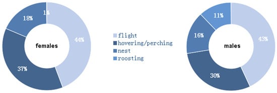 Both females (constrained sample vs. expected chi-squared test = 1405.4; d.f. = 3; p < 0.01) and males (constrained sample vs. expected chi-squared test = 2538.4; d.f. = 3; p < 0.01) diverged from the perfect balance among the four activities (Figure 4). While roosting was almost null in females, this activity occupied 11% of the time in male red-footed falcons. By contrast, females spent 7% more of the time than males did for hovering and perching. The male vs. female activity budgets were significantly different (unconstrained Sample 1 vs. Sample 2 chi-squared test = 406.34; d.f. = 4; p < 0.01).