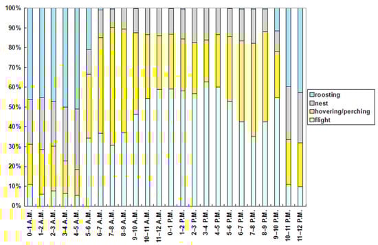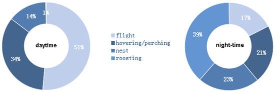 In the daytime, the red-footed falcons spent 51% of the time in flight, while hovering or perching activity accounted for 34% of the time (Figure 5). In the night-time, flight activity was one-third of that in the daytime, while roosting increased by up to 39% of the time (1% in the daytime). Both in daytime (one constraint sample vs. expected chi-squared test = 6209.80; d.f. = 3; p < 0.01) and at night (one constraint sample vs. expected chi-squared test = 334.66; d.f. = 3; p < 0.01), the red-footed falcons’ behavior deviated from the null hypothesis of perfect balance among the four activities. The daytime vs. night-time activity budgets were significantly different (unconstrained Sample 1 vs. Sample 2 chi-squared test = 4756.9; d.f. = 4; p < 0.01).
