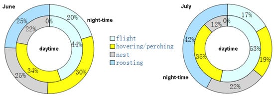 The nested ethograms (Figure 6) show that, in June, the red-footed falcons’ behavior diverged between the daytime and night-time, primarily because of flight activity (44% and 20%, respectively) and roosting (<1% and 25%, respectively). Instead, hovering or perching and activity at the nest occupied about the same amount of time. By contrast, in July, all of the four behaviors were largely different between daytime and night-time, particularly roosting (<1% in the daytime and 42% at night).
