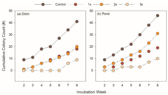 Visible microbial colonies accumulated in all treatments for both habitats. Control Winogradsky columns typically had double the number of visible colonies compared with all Roundup treatments (Figure 1). However, the differences between cumulative counts within each habitat were never significantly greater in either the ditch (χ2df = 18 = 28.20, p = 0.06) or pond (χ2df = 18 = 18.84, p = 0.40). Colony developments in the 1x and 2x treatments were very similar across both habitats.