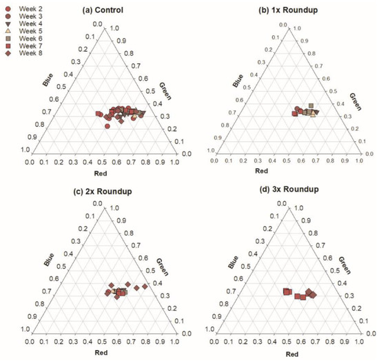 Visible microbial colony colors measured from the ditch habitat for each level of Roundup addition. Each axis is a proportion of 255, maximal value for each color.
