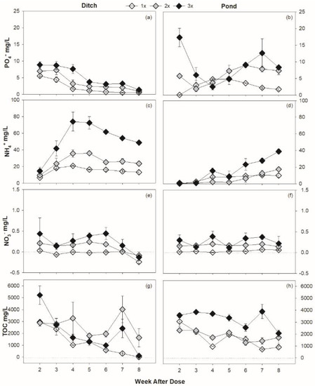 Across both habitats and all treatments, phosphate and ammonium concentrations increased with the addition of Roundup (Table 1). However, the pattern of phosphate (F1,16 = 14.54, p < 0.01) and ammonium (F1,16 = 236.45, p < 0.01) was different between the ditch and pond (Figure 4a–d). Nutrient concentrations typically significantly decreased over time following the addition of Roundup (Table 2). Phosphate concentrations increased initially with the addition of Roundup, and higher amounts of Roundup resulted in higher concentrations of phosphate, but these elevated levels decreased by the fourth week. Roundup additions resulted in a maximum average of 7.15 mg/L above control in the ditch and 7.70 mg/L above control in the pond, both during the second week of incubation. Ammonium followed a similar trend as phosphate, reaching an average maximum of 43.52 mg/L in the ditch during the second week and 22.18 mg/L in the pond over control, but not until the final week of incubation. Nitrate concentrations were consistently low and never exhibited a peak throughout the incubation period. Nitrate concentrations were also not different between habitats (F1,16 = 1.53, p = 0.23).