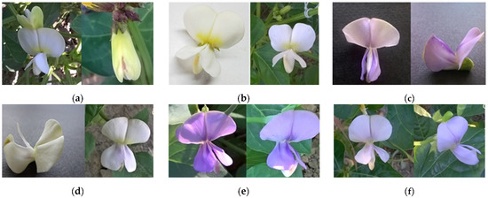 Flower color of the plant material used, where: (a) flowers of breeding line IT97K-499-35, (b) flowers of local population VG2, (c) flowers of local population VG21, (d) flowers of local population Vg60, (e) flowers of local population BGE038478, and (f) flowers of local population BGE038479.