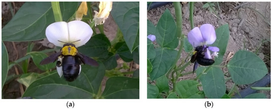 (a) Xylocopa pubescens foraging in cowpea flower of VG2; (b) Xylocopa valga foraging in cowpea flower of BGE038478.