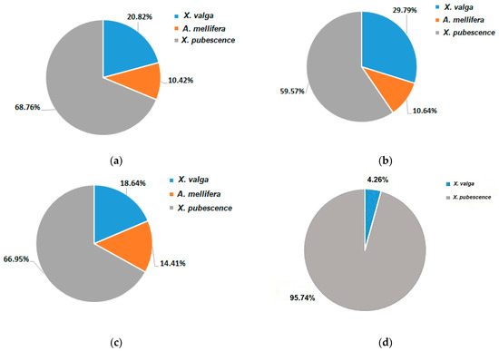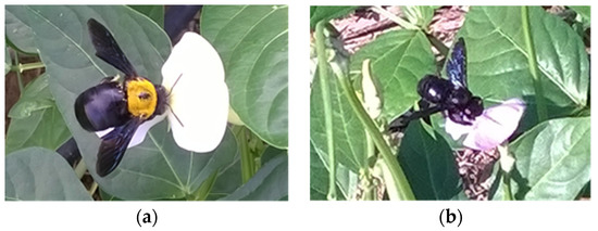 Bee species from various families are reported worldwide as cowpea pollinators [28], such as the honeybee (Apis mellifera Linnaeus, 1758) [16,17], species of the genus Xylocopa [17,22,26,31,32], bumblebees (Bombus sp.) [17,29], and species of the Megachilidae family [17,22,31]. In addition, hummingbirds (family Trochilidae) [29] and species of the families Noctuidae, Pieridae, and Vespidae [28] are also mentioned as effective pollinators. Contradictory results were obtained for species of the Lepidoptera order and honeybees regarding if they can be positive pollinators of cowpea [17,28,31,33].
