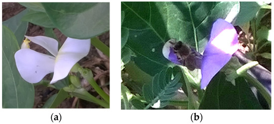 Pollinators observations took place only during days with favorable weather conditions for insects, i.e., not rainy, or with strong wind blowing. All observations on pollination carried out by the same researcher. Pollinators observations lasted for five minutes per plot and were recorded in the same ten plants that the floral traits were measured. Positive visits were considered the ones that pollinators were approaching the flower’s physical opening and not from the side (Figure 2) when a flower was completely open according to the protocol described by Suso et al. [12]. The flowers that were visited positively by a pollinator species then changed their color and started to close, as they did not need to advertise themselves anymore. Pollinators abundance (number of positive pollinator species recorded per plant) and foraging activity (number of positive pollinators visits recorded per plant) were then determined. The seed color, eye color, flower color, and raceme position characterization was based on cowpea descriptors proposed by the International Board for Plant Genetic Resources [38].
