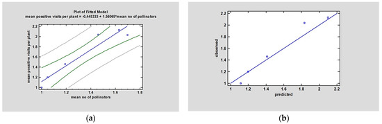 (a) Regression model of foraging behavior and pollinator abundance; (b) Predicted and observed values for the regression of foraging behavior on pollinator abundance.