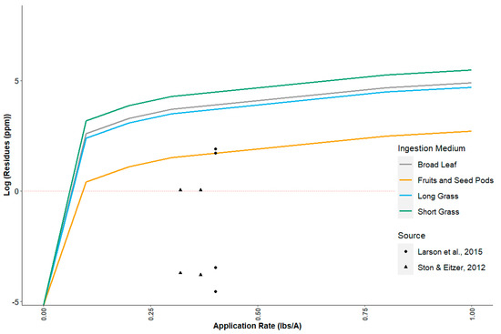 88]. Dietary residues resulting from foliar spray applications were estimated and modeled as described above for all pesticides. All comparisons use the expected fledglings/female/year as the model prediction expressed as percentage reductions under exposure conditions compared to unexposed.
