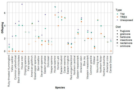 Figure 4). This was true despite the added possibility of adult mortality modeled by TIM using the empirical LD50 and slope. No species experienced complete reproductive failure and the maximum observed effect was a 21% reduction (grasshopper sparrow,