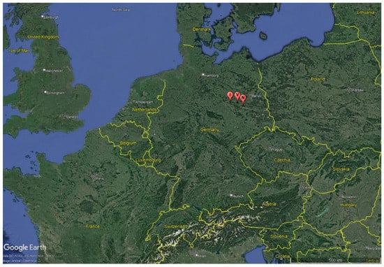 - Google. n.d. Locations of Ihle, Nieplitz and Verlorenwasser. Data SIO, NOAA, U.S. Navy, NGA, GEBCA. Image Landsat/Copernicus. Available online: https://earth.google.com/web/search/ihle/@49.42246021,8.12620422,-57.14636488a,1828973.53736222d,35y,-0.32186261h,23.21376508t,0r/data=CigiJgokCZXaZMslE0VAEYEcRHJFEEVAGQC0GiHTVQRAIauPEd9hMQRA (accessed on 26 December 2022).