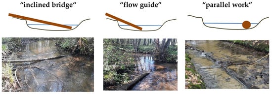 Wood structures caused by self-dynamics and natural input are present in all three streams. However, the Ihle additionally contains some wood that was brought in as part of restoration measures. These wooden structures were designed in such a way (e.g., felling of a whole tree) that they are similar to the natural wooden structures in the other two streams. The proportion of wood in the total bottom surface is at least seven percent. The control sections were between the wood sections, have similar boundary conditions and contained no or only little wood. The wood sections have inclined bridges, flow guides and parallel wood position types (Figure 2).