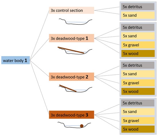 Design of the experiment for a total of three sampled streams. Different wood structure types and the control sections were sampled in three replicates. Different substrates detritus, sand, gravel and wood were each taken as a mixed sample from five individual samples [12], modified.