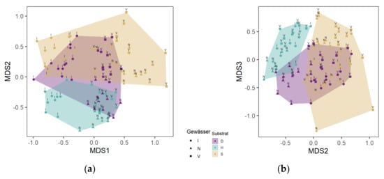 Non-metric multidimensional scaling (NMDS) of MI samples from the WS (a) and the CS (b) of streams I—Ihle, N—Nieplitz and V—Verlorenwasser and the substrates D—detritus, H—wood and S—sand. Stress—0.17 (©Katja Westphal).