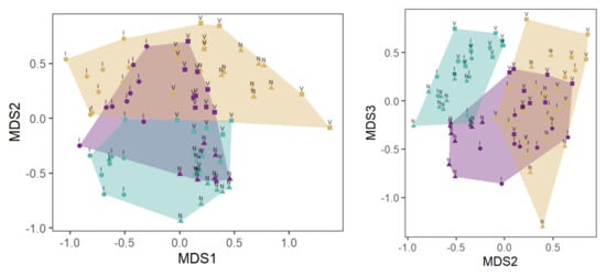 Nonmetric multidimensional scaling (NMDS) of MI samples from WS with I = Ihle, N = Nieplitz and V = Verlorenwasser as well as D = detritus, H = wood and S = sand. stress = 0.16 (©Katja Westphal).