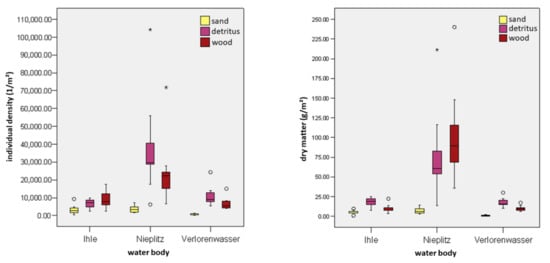 Density of individuals per m2 (left) and dry matter in g per m2 (right) of MI for the substrates sand, detritus and wood of WS, divided among the water bodies Ihle, Nieplitz, and Verlorenwasser. The box plots show the minimum (lower antenna), the two quartiles, the median, and the maximum (upper antenna) of the distributions. The circles marks are suspected to be outliers, and the star marks the extreme values of the distributions.
