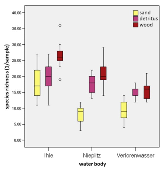 Species richness of the macroinvertebrates per sample for the substrates sand, detritus and wood of the WS, related to the streams Ihle (except gravel), Nieplitz, and Verlorenwasser. The box plots show the minimum (lower antenna), the two quartiles, the median, and the maximum (upper antenna) of the distributions. The circles marks are suspected to be outliers.