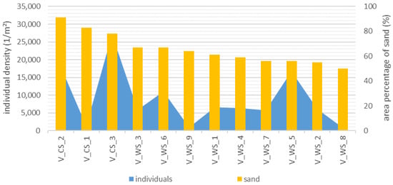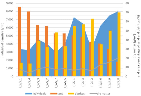 Individual density and dry matter in g per m2 depend on the area percentage of sand and detritus (%) of WS and CS in Ihle (I) stream sorted according to the proportion of sand.