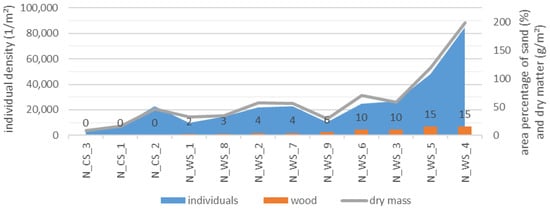 Individual density per sample and dry matter in g per m2 as a function of the area percentage of wood (%) in WS and CS in Nieplitz (N) sorted according to the proportion of detritus.