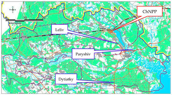 137Cs circulation in various organs of the Scots pine and mosses in the exclusion zone of the Chornobyl nuclear power plant (ChNPP) was researched. The sampling sites are located at various distances and directions from the Chornobyl NPP (Figure 1). The three chosen sampling sites in the Chornobyl Exclusion Zone are identified by the following coordinates: Dytiatky (30.12449 E, 51.13088 N, distance from ChNPP, 29.9 km), Paryshiv (30.32473 E, 51.30069 N, distance from ChNPP, 18.8 km), Leliv (30.16031 E, 51.32326 N, distance from ChNPP, 8.4 km). A sampling of 1st and 2nd branches and needles was conducted in 2014 and 2015, once every two weeks. He outer bark was sampled from February 2014 to December 2015, and moss from May 2014 to December 2015. Wood was sampled only from November 2014. The studied sampling sites had an area of approximately 30 m2 and a sod-podzolic soil. The vast majority of woody vegetation was the Scots pine (Pinus sylvestris L.).
