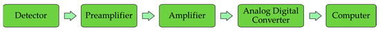The specific activity of 137Cs was measured using a CANBERRA gamma spectrometer unit with a coaxial high-purity HPGe semiconductor detector (GC6020 model). The detection unit was covered with a 100 mm lead screen, which allowed practical measurements of samples with relatively low radionuclide-specific activity. A schematic block diagram of the gamma spectrometer is shown in Figure 2. Figure 3 shows a photo of the gamma spectrometric setup used to determine the specific activity of 137Cs in the samples and the spectrum displayed on a computer screen.