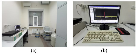 Gamma spectrometric setup: (a)—general view, (b)—spectrum displayed on a computer screen.