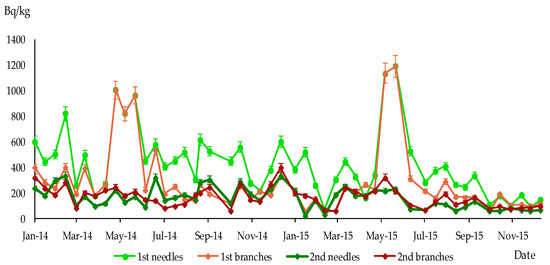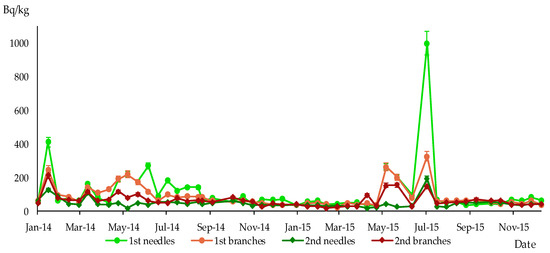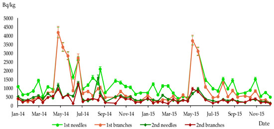 The maximum specific activity of 137Cs in one-year-old branches and needles was reached between May and August 2014 and 2015 in all sampling sites. The subsequent increase in specific activity levels of 137Cs in branches and needles was observed in the second year of their life during the next growing season (see Figure 4, Figure 5 and Figure 6).