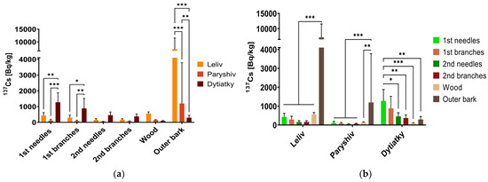 Average concentrations of 137Cs in P. sylvestris (a) according to the organ of the tree and (b) according to the sampling site, Bq/kg dry weight. The variables of significance are labelled with asterisks (* p ≤ 0.05, ** p ≤ 0.01, *** p ≤ 0.001).