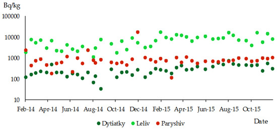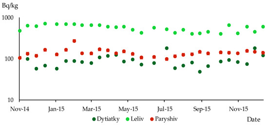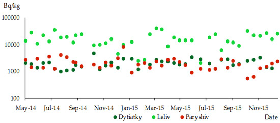 Significant seasonal changes in the content of 137Cs in wood in all areas of the study could not be recorded. One can speak of a seasonal trend in the accumulation of this radionuclide in Leliv and Paryshiv (Figure 8). In the territory of these sampling sites, the highest values of 137Cs specific activity levels were observed from November 2014 to March 2015 and at the end of 2015. The lowest values of the specific activity of 137Cs in wood in Leliv and Paryshiv were observed from mid-summer to mid-autumn. In Dytiatky, the minimum values of the particular radiocaesium activity were noted in different seasons—winter, summer and autumn.