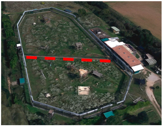 The photograph depicts the two outdoor chimpanzee facilities, which are separated by an electrified fence (marked in red) [75].