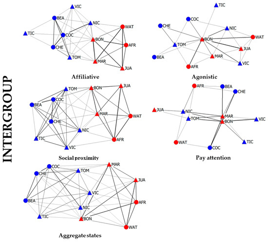 The social network graphs consist of nodes (vertices) representing chimpanzees and links (edges) representing the extent (normalized rates) to which chimpanzees were observed to interact with each other. Social networks in this study were based on weighted dyadic interactions of chimpanzees within the same group (intragroup) as well as chimpanzees belonging to different groups (intergroup). A total of 4 interaction matrices were created for each group and for the intergroup analysis, based on agonistic behaviors, affiliative behaviors, social proximity, and the combined Aggregate State. The Aggregate matrix reflects the combined interactions of the previous three matrices, without differentiating between the aggregated items. For the intergroup analysis, a fifth matrix was created based on pay attention data, which could only be observed between individuals belonging to different groups, due to its definition. Being considered a unilateral intergroup interaction without an equivalent on the intragroup level, it was excluded from the Aggregate State analysis.