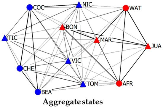 Figure 3 represents the classical approach of only considering individuals from one group, i.e., only taking interactions between members of the same group into account, while ignoring interactions that occurred on an intergroup level. Here, several networks were drawn, based on the different interaction types (agonistic, affiliative, social proximity), as well as a combined version in which all three interaction types were aggregated into a single network (Aggregate State).